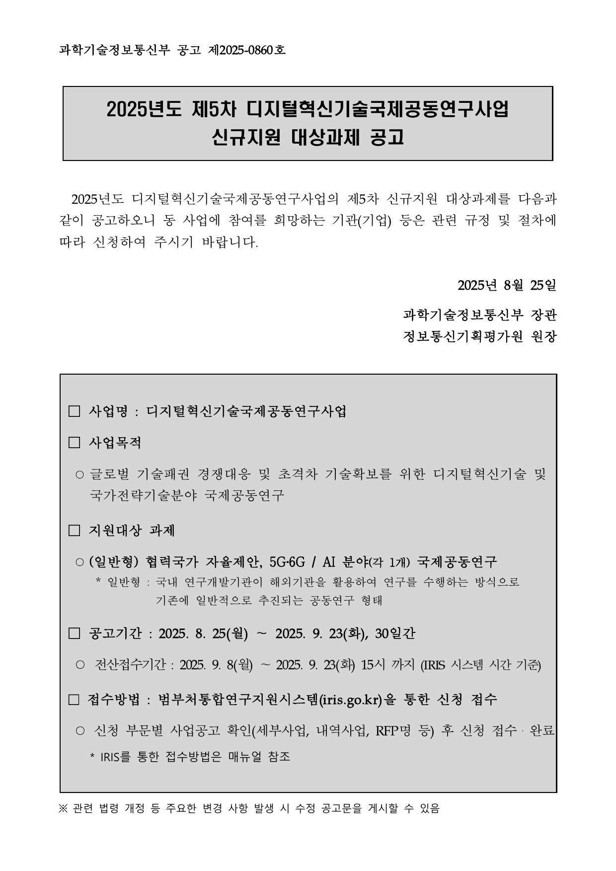 PDF문서붙임1. 2025년 제5차 디지털혁신기술국제공동연구사업 신규지원 대상과제 공고문.pdf