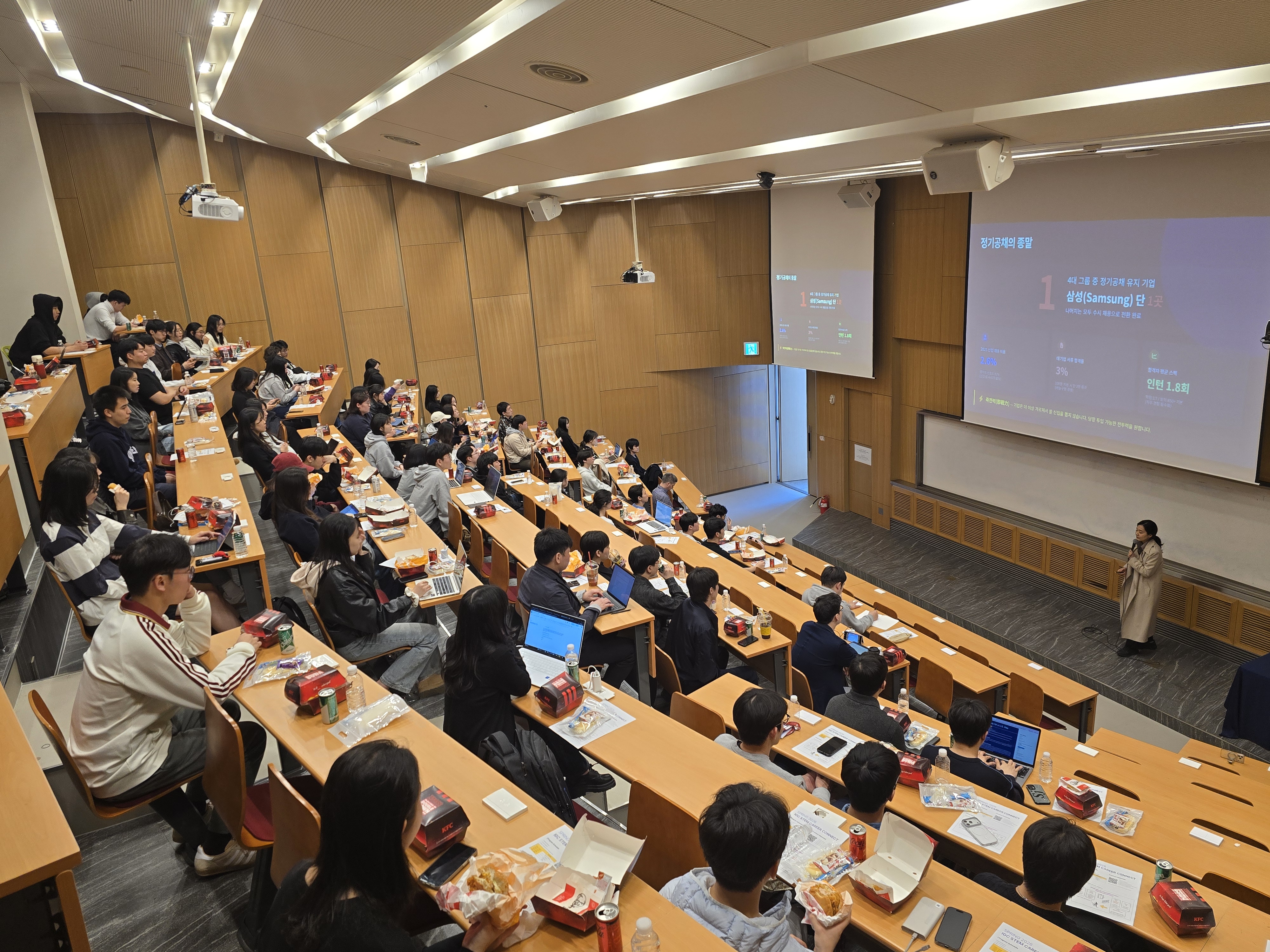 Following the keynote session, students participated in two track sessions of their choice, each focused on a different STEM field. The available tracks included Computer & Data Science, Electrical and Computer Engineering, Mechanical Engineering, and Life Sciences & Biotechnology. These sessions were led by industry professionals from leading companies such as Maum.ai, SK hynix, Datadog Korea, and Celltrion. During these lectures, speakers shared their experiences working in the industry and provided insight into what employers look for when hiring new graduates. The track sessions also covered practical topics such as common mistakes applicants make during the job search, effective résumé and portfolio strategies, and how students can design their career paths within their fields. Students were able to hear both successful and unsuccessful case examples, which helped illustrate the realities of the job application process.